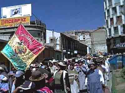 Il y a quelques mois [en février 2003], une autre explosion populaire, dans toute la Bolivie, a même vaincu le Fonds monétaire international. Le Fonds a vendu cher sa défaite, qui a coûté la vie à trente personnes, assassinées par lesdites forces de l'ordre, mais le peuple a réussi son exploit. Le gouvernement n'a eu d'autre remède que d'annuler l'impôt sur les salaires que le FMI avait ordonné de prélever.